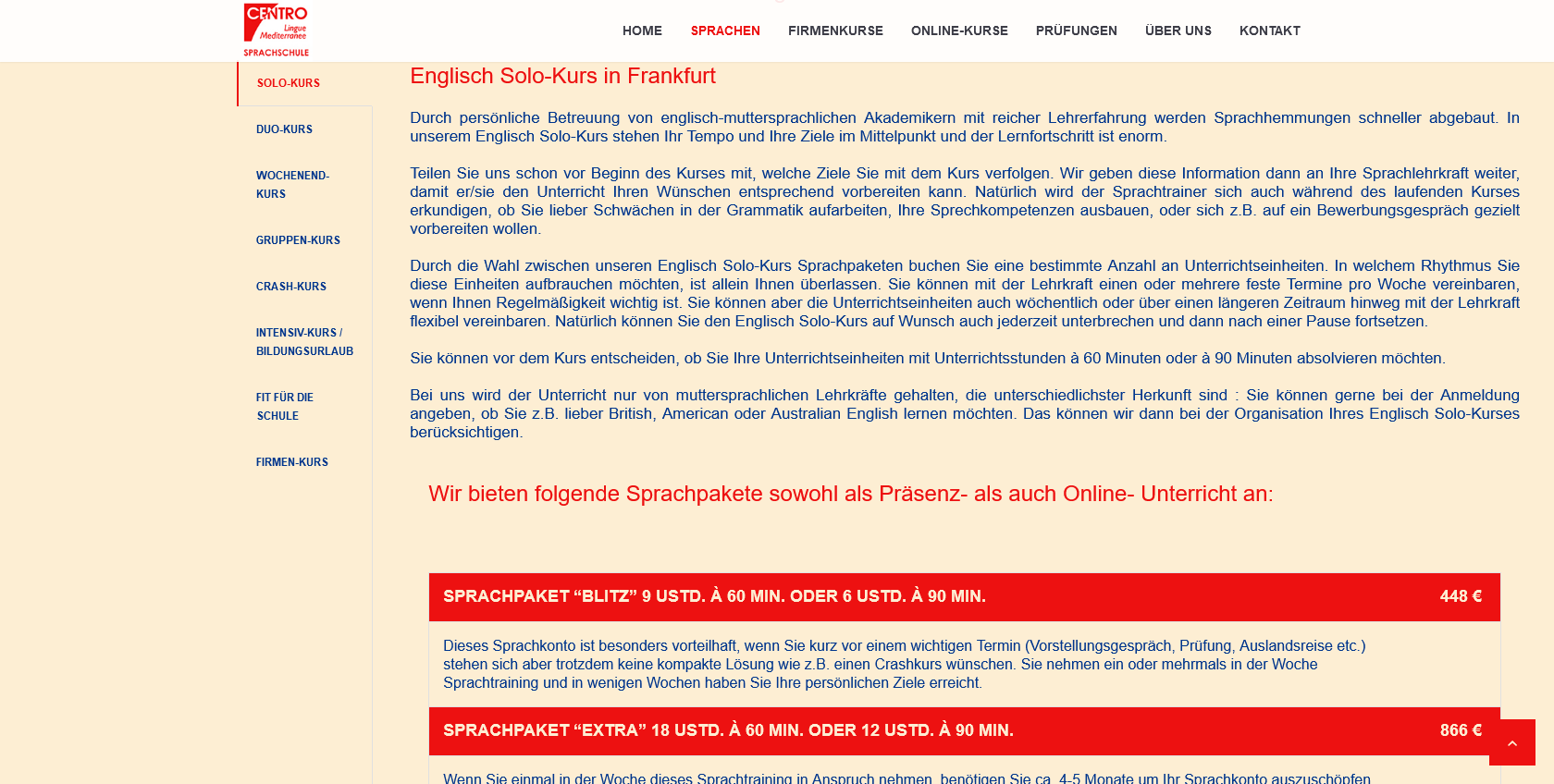 Sprachschule Centro – Englischkurse, Tabs und Tabelle